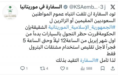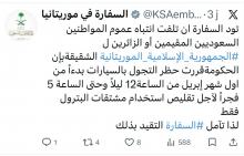 دعت سفارة المملكة العربية السعودية لدى موريتانيا، جميع أفراد الجالية السعودية المقيمين أو الزائرين لموريتانيا، إلى ضرورة التقيد بالإجراءات التي اعتمدتها الحكومة الموريتانية بغية ترشيد تكاليف الوقود ومشتقاته.