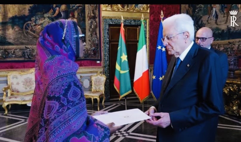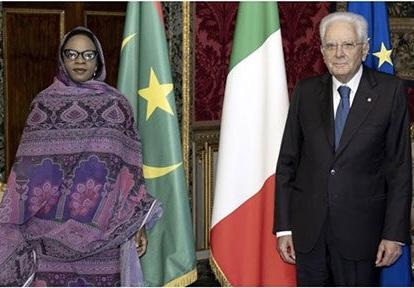 سلمت خديجة امبارك فال، الخميس في روما، أوراق اعتمادها للرئيس الإيطالي؛ سيرجي مارتيلا، سفيرة فوق العادة و كاملة السلطة للجمهورية الإسلامية الموريتانية لدى الجمهورية الإيطالية.