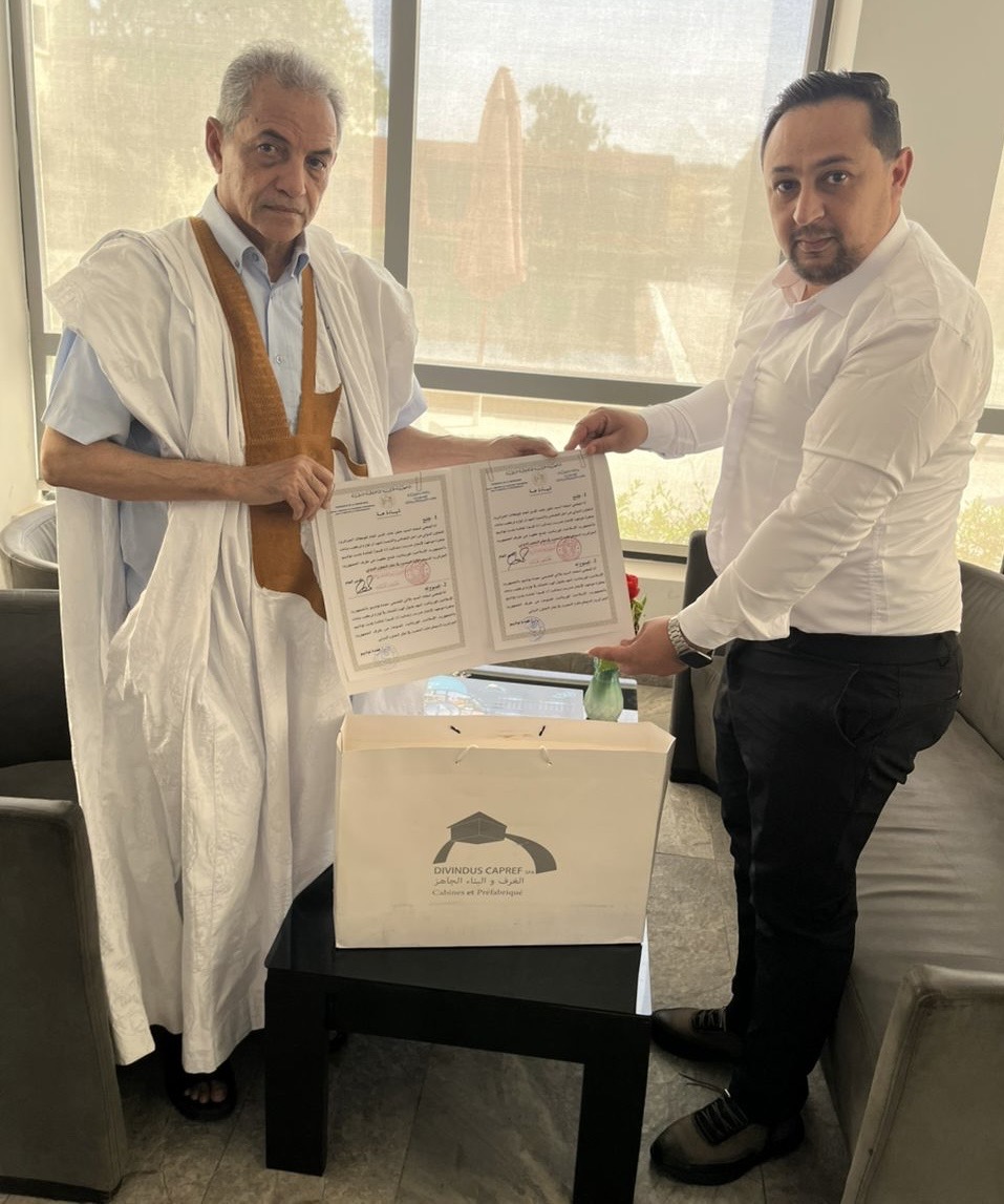 تم اليوم في نواكشوط توقيع اتفاقية هبة بين السيد القاسم بلالي، النائب والعمدة لمدينة نواذيبو، والسيد سعد محمد الأمين، مدير المشروع في مجموعة DIVINDUS-CAPREF، المكلف من طرف الوكالة الجزائرية للتعاون الدولي من أجل التضامن والتنمية.