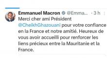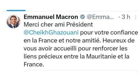 أعرب الرئيس الفرنسي السيد إيمانويل ماكرون، في تغريدة له، عن خالص شكره وتقديره لرئيس الجمهورية السيد محمد ولد الشيخ الغزواني، مثمّنا الثقة التي يوليها لفرنسا، ومشيدا بمتانة علاقات الصداقة التي تجمع البلدين.
