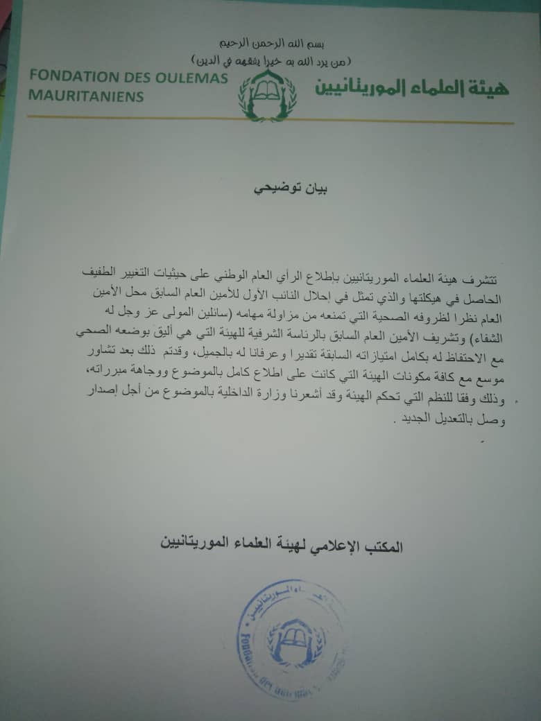 أكدت هيئة العلماء الموريتانيين، أن الأمين العام السابق للهيئة الشيخ حمدن ولد التاه نقل إلى الرئاسة الشرفية للهيئة مع الاحتفاظ له بكامل امتيازاته السابقة.