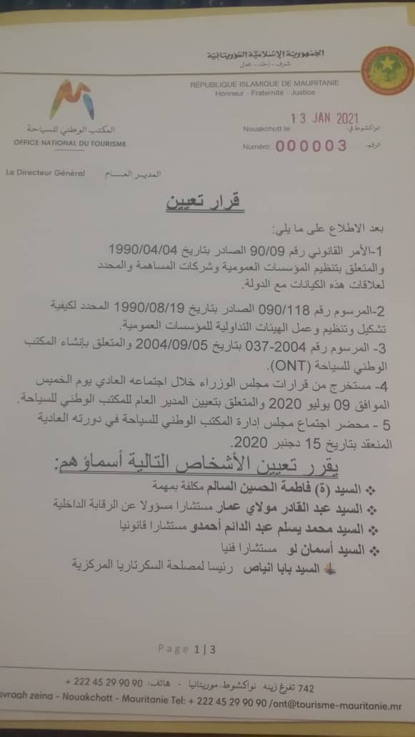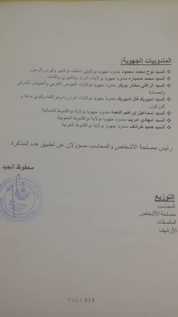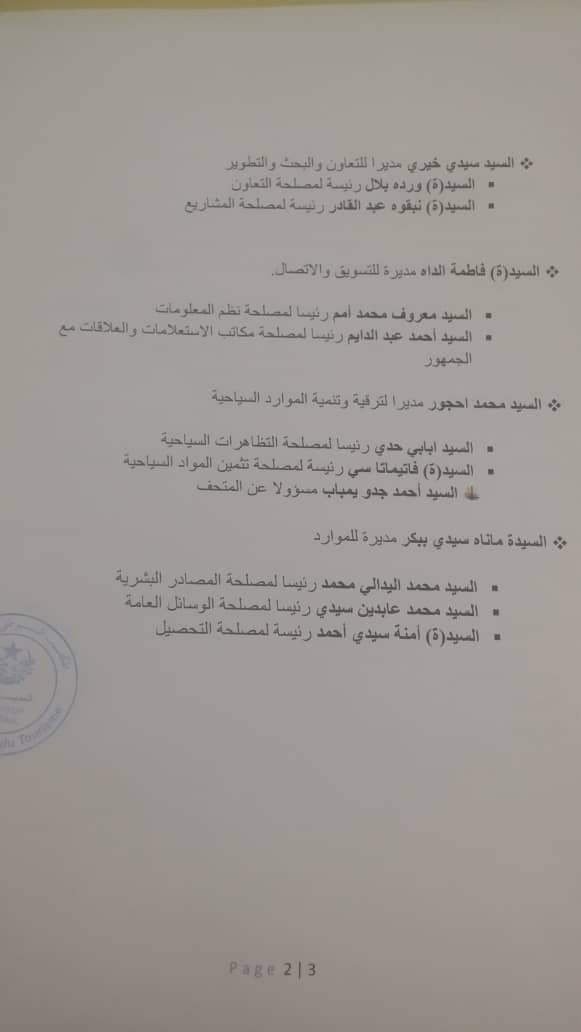 وقد شملت التعيينات وفق مذكرة موقعة من طرف المدير العام محفوظ ولد الجيد، مندوبين في ولايات نواكشوط والداخل، ومديرين للتعاون والتسويق والاتصال وترقية الموارد السياحية، بالإضافة إلى مستشارين، وغيرها.