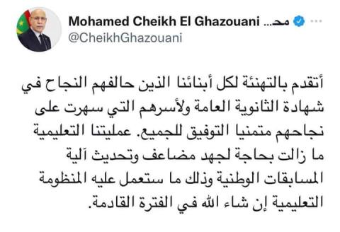 هنأ رئيس الجمهورية محمد ولد الشيخ الغزواني كل الناجحين في امتحان شهادة البكالوريا ؛ مشيدا بدور أسرهم في السهر على تدريسهم ومراقبة دراستهم .