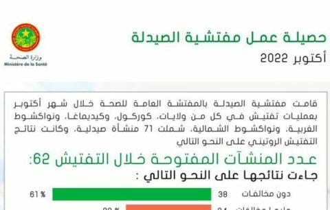 أعلنت وزارة الصحة، اليوم (الخميس)، أن حصيلة عمل مفتشية الصيدلة التابعة للمفتشية العامة للصحة، خلال أكتوبر الماضي، شملت 71 منشأة صيدلية في ولايات كوركول، كيديماغا، نواكشوط الغربية، ونواكشوط الشمالية.