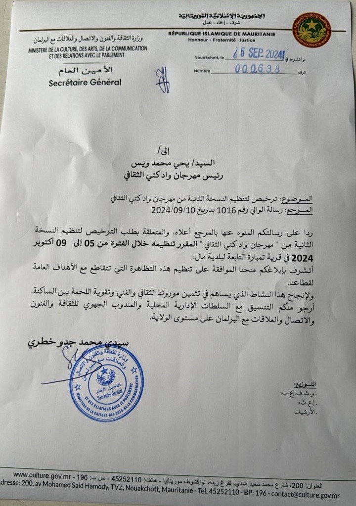 وأكدت وزارة الثقافة والفنون والاتصال والعلاقات مع البرلمان اعتماد النسخة الجديدة من المهرجان؛ مؤكدة، عبر رسالة من الأمين العام إلى ولد ويس، تطابق هذه التظاهرة الثقافية مع أهداف القطاع العامة.