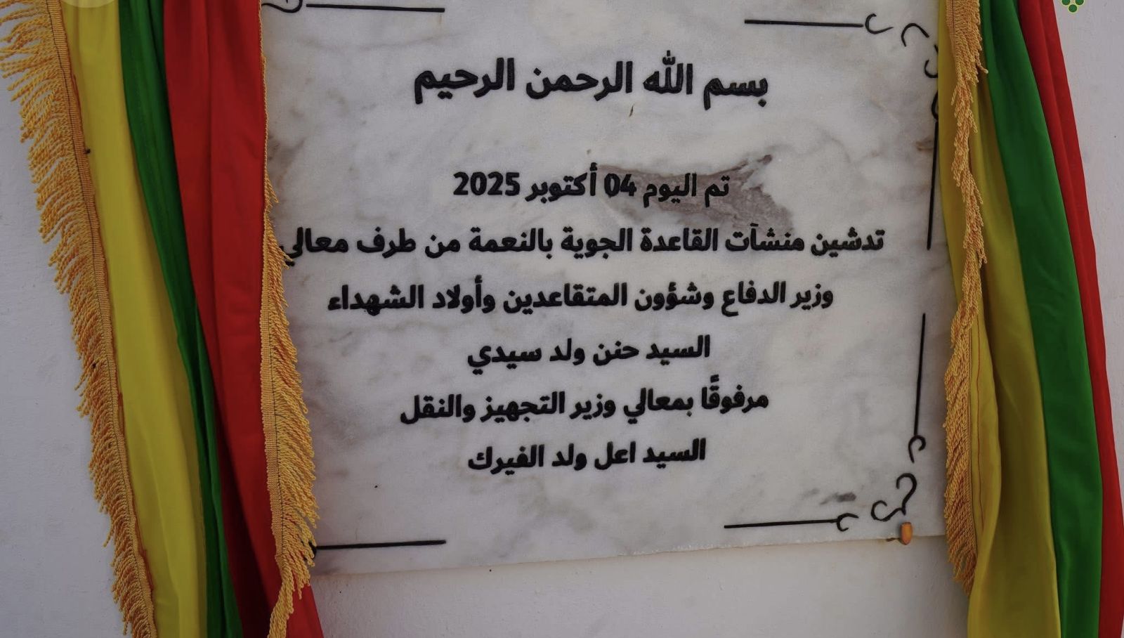 باشر وزير الدفاع وشؤون المتقاعدين وأولاد الشهداء؛ حننا ولد سيدي، اليوم (السبت) في القاعدة الجوية في مدينة النعمة، رفقة كل من وزير التجهيز والنقل؛ اعل سيد أحمد الفيرك، وقائد الأركان العامة للجيوش؛ الفريق محمد فال الرايس الرايس، وقائد أركان الجيش الجوي؛ الفريق محمد الشيخ بيده، وقائد أركان الدرك الوطني؛ الفريق أحمد محمود ولد الطايع.