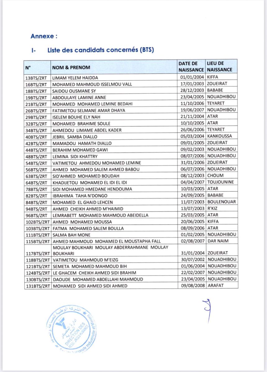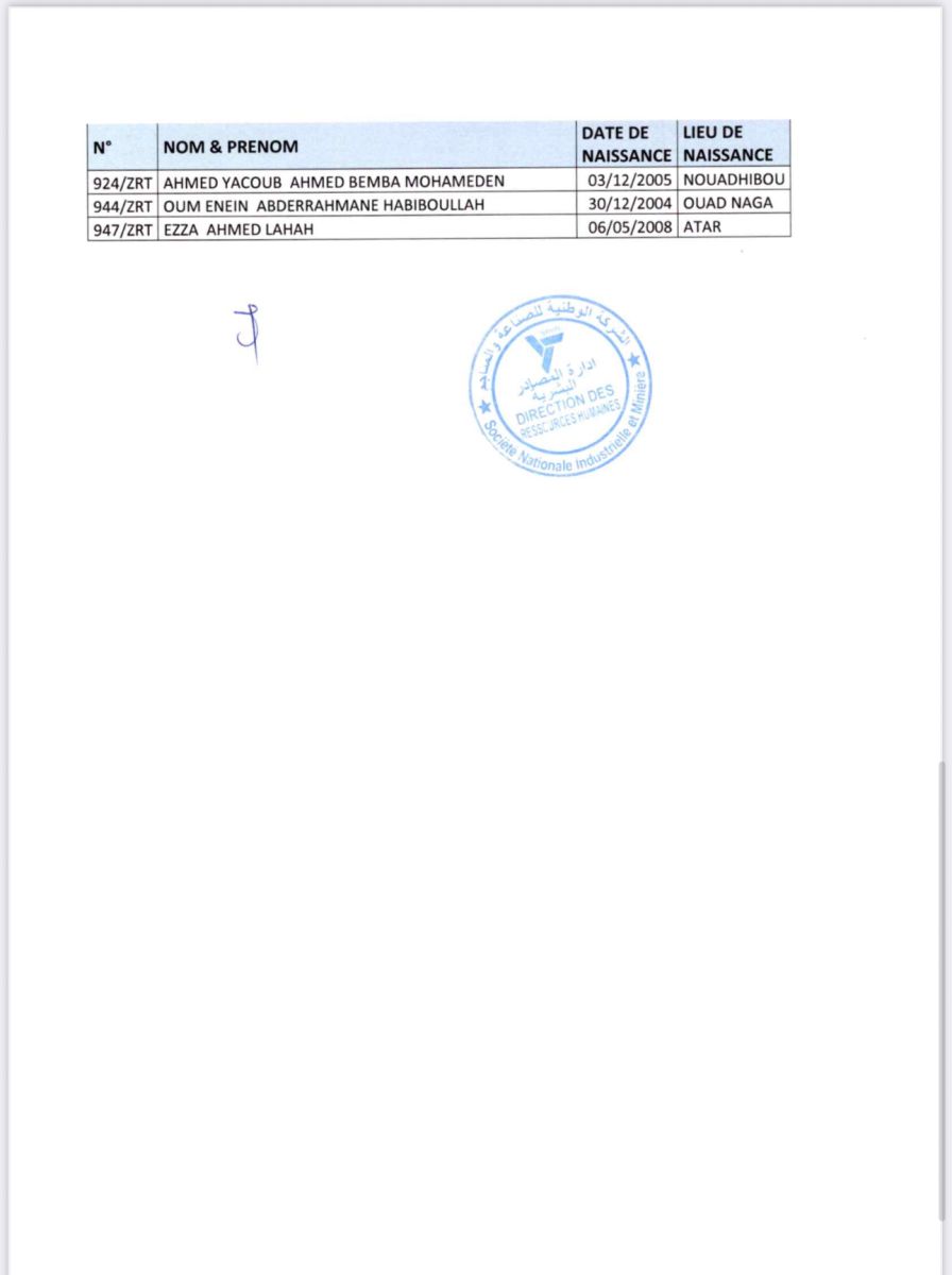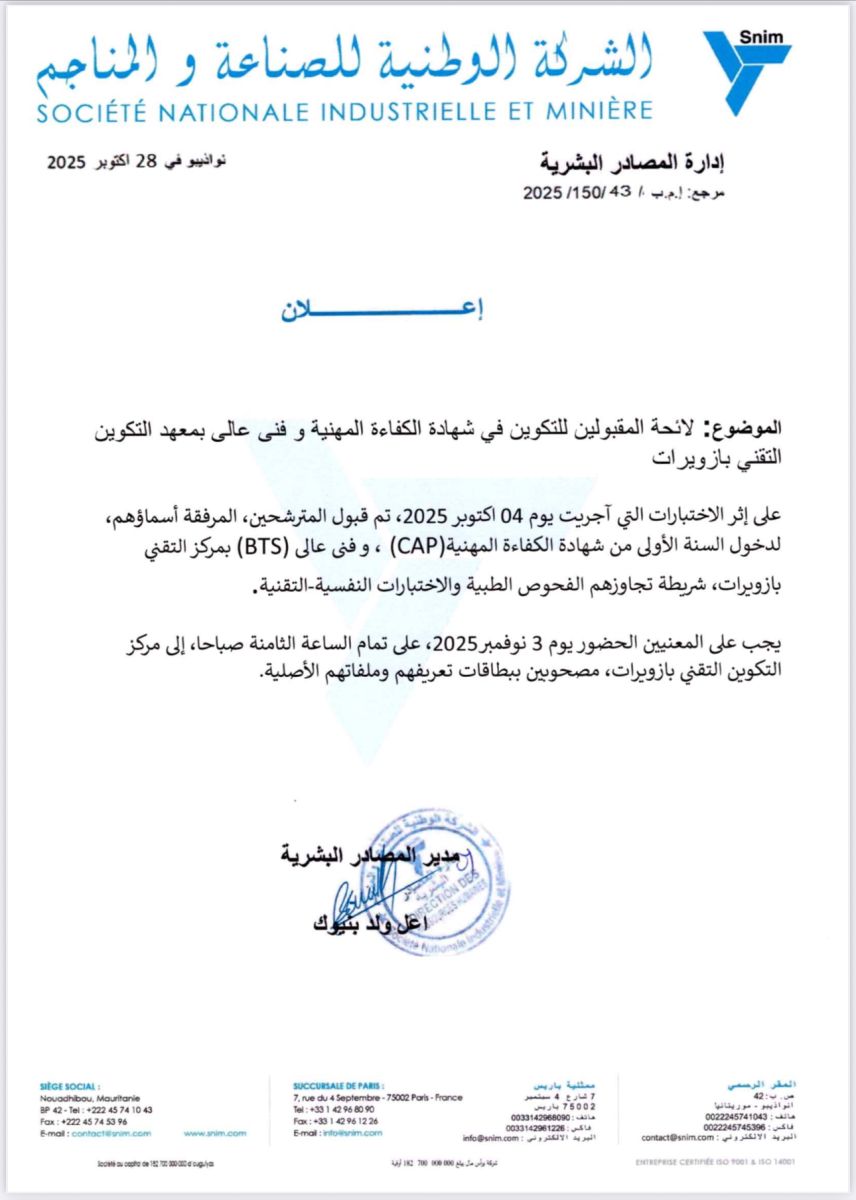 أصدرت إدارة المصادر البشرية بالشركة الوطنية للصناعة والمناجم (سنيم)، مساء اليوم الثلثاء، لائحة بأسماء المقبولين للتكوين في شهادة الكفاءة المهنية (Cap) و فني عالٍ (BTS) بمعهد التكوين التقني بازويرات