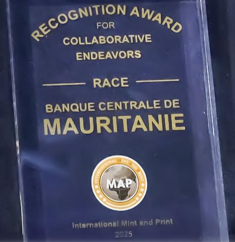 فاز البنك المركزي الموريتاني، اليوم الجمعة، بجائزة "الابتكار" في مؤتمر الطباعة وسك العملة (MAP 2025) المنعقد في مدينة إسطنبول بتركيا.