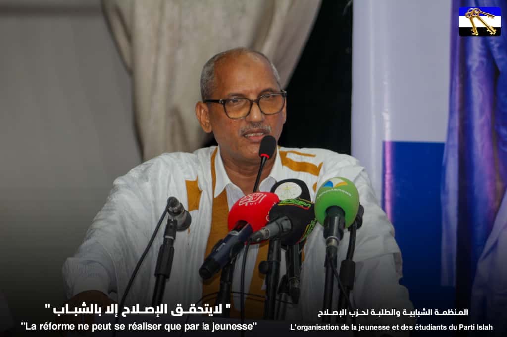 ودعا إلى تعزيز مشاركة الشباب في جهود الإصلاح الحالية ضد المفسدين والعدميين والخطابات الغير مشروعة ، ونوه بشباب الحزب من أجل أن يكون في طليعة العمل السياسي والاجتماعي، ويقف في وجه الخطابات القبلية والشرائحية والطائفية وأهاب بالشباب أن يعمل بشكل جاد لتكوين مدرسة للإعداد السياسي لشباب قادة ومناضلين سياسيين مخلصين للوطن والقيم السياسية المستنيرة الخاصة بحزبهم .و من جهتها أشادت الأمينة العامة للحزب الوزيرة مسعودة بنت بحام ولد محمد لغظف بالحضور الشبابي، قائلة إن الحزب لن يدخر جهدا في مؤازرة الشباب ودعت إلى مواكبة برنامج رئيس الجمهورية وتثمين إنجازاته.