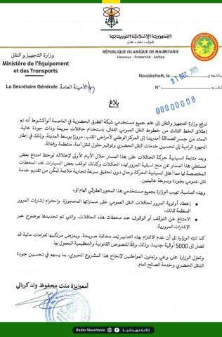 ترفع وزارة التجهيز والنقل إلى علم جميع مستخدمي شبكة الطرق الحضرية في العاصمة أنواكشوط أنه تم إطلاق الخط الثالث من خطوط النقل العمومي الفعّال، باستخدام حافلات سريعة وذات جودة عالية، الممتد من جسر الصداقة (مدريد) إلى المركز الوطني لأمراض القلب، مرورًا بوسط المدينة، وذلك في إطار الجهود الرامية إلى تحسين خدمات النقل الحضري وتوفير حلول تنقل آمنة، منتظمة وفعّالة.