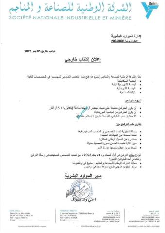 أعلنت الشركة الوطنية للصناعة والمناجم (سنيم) عن فتح باب الاكتتاب الخارجي للمهندسين في التخصصات التالية: