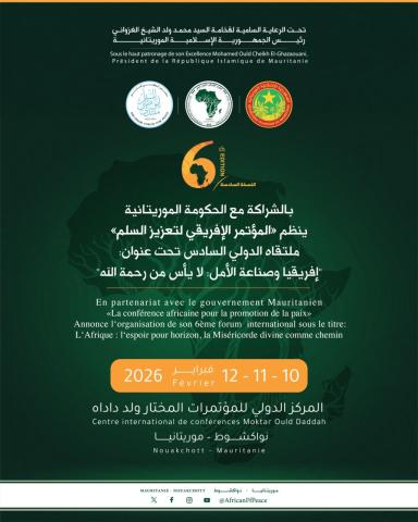 أعلن المؤتمر الإفريقي لتعزيز السِّلم، اليوم الأربعاء، أن العاصمة الموريتانية نواكشوط ستستضيف الملتقى الدولي السادس خلال الفترة من 10 إلى 12 فبراير 2026، برعاية سامية من فخامة رئيس الجمهورية محمد ولد الشيخ الغزواني، وبالرئاسة العلمية لمعالي الشيخ عبدالله بن بيّه.وأوضح بيان المنظمين أن الملتقى سيُعقد في المركز الدولي للمؤتمرات – المختار ولد داداه (قصر المؤتمرات القديم)، تحت شعار: «إفريقيا وصناعة الأمل: لا يأس من رحمة الله»، بهدف بلورة رؤية عملية لاستعادة السِّلم في القارة، عبر مقاربات تستند إلى المرجعيات العلمية والتربوية، وتعزيز الشراكات بين الحكومات والمؤسسات الدينية والمدنية.وأضاف البيان أن برنامج الملتقى يتضمن تسليم جائزة السِّلم لعام 2026 إلى فخامة الرئيس التشادي محمد إدريس ديبي، إلى جانب عقد قمة بعنوان: «الشباب والمرأة.. صُنّاع الأمل الموعود» برعاية السيدة الأولى الدكتورة مريم محمد فاضل الداه، لتكون منصة للحوار وتبادل الرؤى بين القيادات النسائية والشبابية الإفريقية. كما أشار البيان إلى إطلاق «قمة الأمن المائي» للمرة الأولى ضمن أعمال الملتقى، باعتبارها مدخلاً استراتيجيًا لتعزيز السِّلم والأمن في إفريقيا.