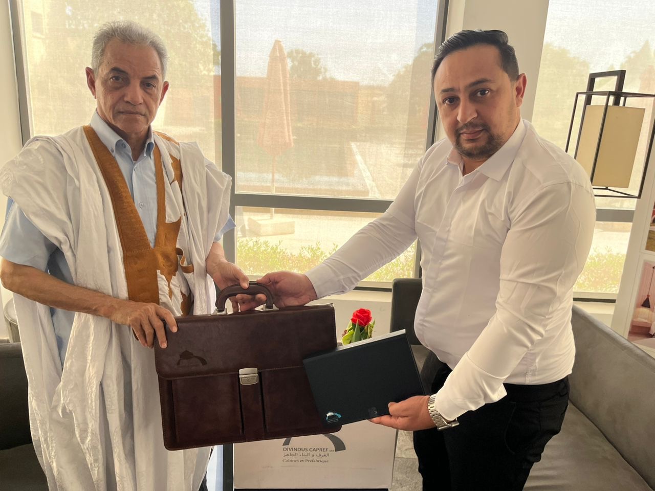 تم اليوم في نواكشوط توقيع اتفاقية هبة بين السيد القاسم بلالي، النائب والعمدة لمدينة نواذيبو، والسيد سعد محمد الأمين، مدير المشروع في مجموعة DIVINDUS-CAPREF، المكلف من طرف الوكالة الجزائرية للتعاون الدولي من أجل التضامن والتنمية.